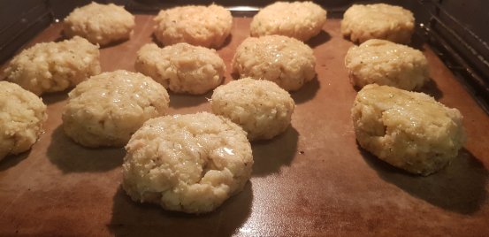 Zu Laibchen formen; Zauberstein mit Kokosöl einfetten, Knödel drauflegen; flach drücken; die Oberfläche mit etwas Öl einpinseln und ca. 30 min auf unterster Schiene am Zauberstein backen!