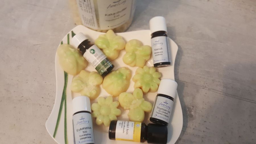 - ätherisches Öl (kBA) zB.: je 2gtt Eukalyptus staigeriana, Lavendel, Thymian CT linalool, Niaouli, Latschenkiefer