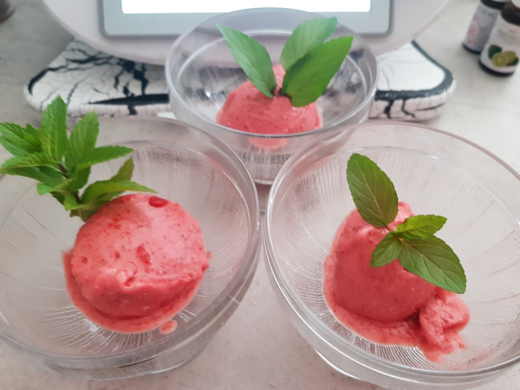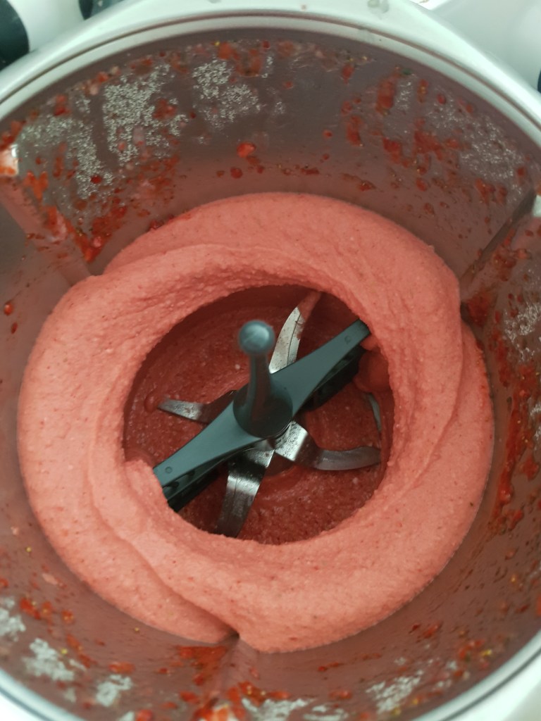 Gefrorenen Früchte hinzu und 10 Sekunden /8 zerkleinern, mit dem Spatel nach unten schieben, Kokosmilch hinzu und 10 Sekunden /4 vermischen. Schmetterling* einsetzen und 20 Sekunden/4 verrühren-sofort genießen.